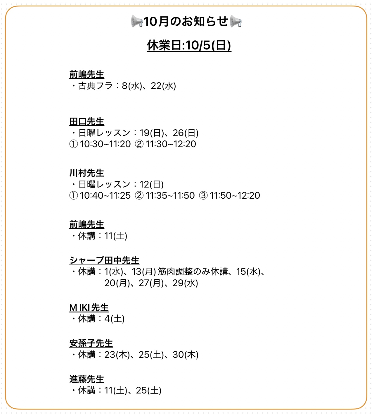 10月のお知らせ📢 2025.09.25 未分類 朝晩、ようやく過ごしやすくなってきましたね。 運動の秋、ミロンで気持ちよくトレーニングをしてくださいね🍁 9/20(土)特別レッスンのお知らせ 前の記事 休講のお知らせ 次の記事