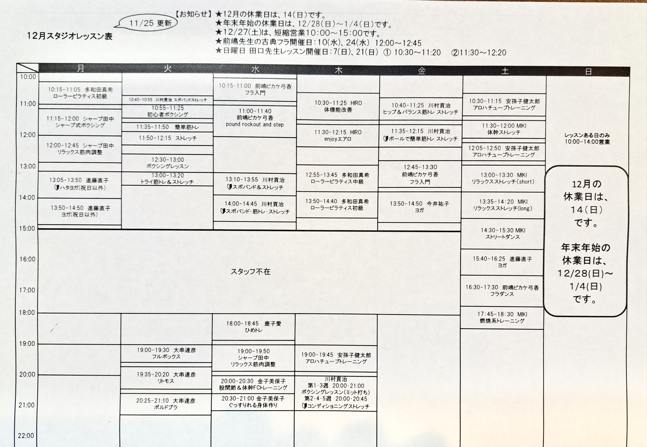 12月のスタジオレッスン表です🤗
