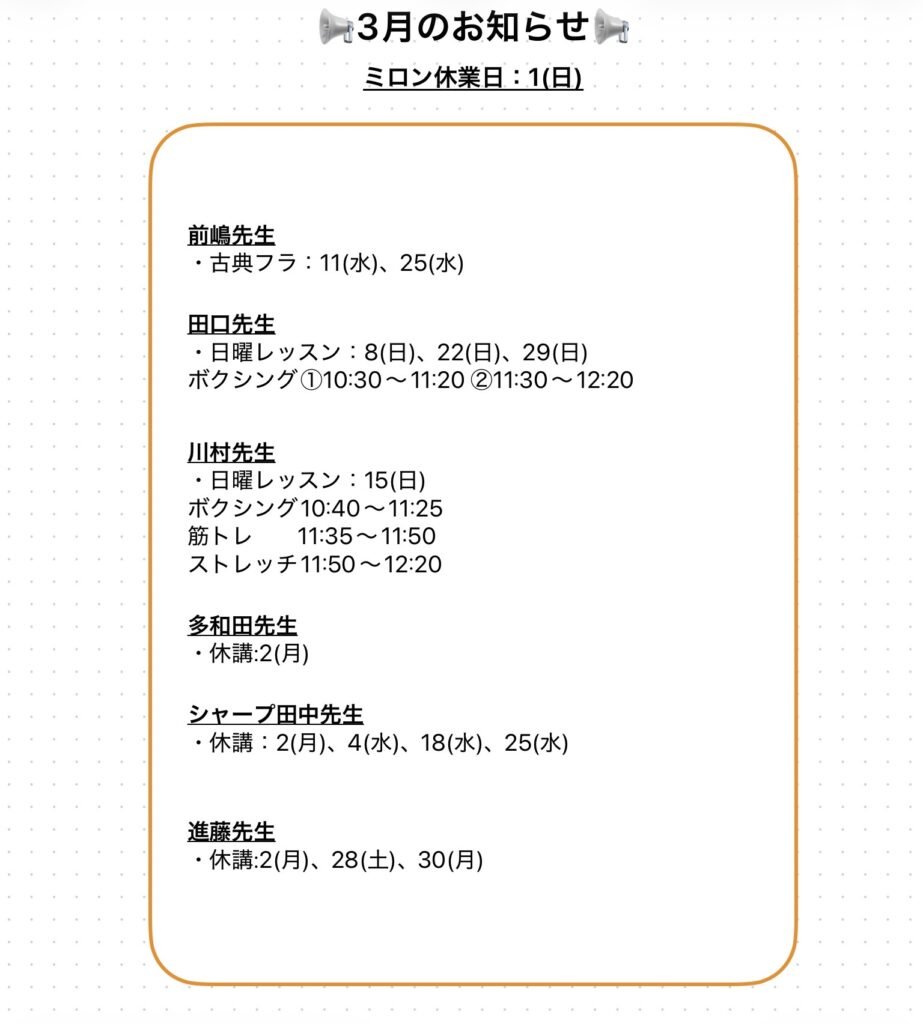 3月のスタジオレッスン表