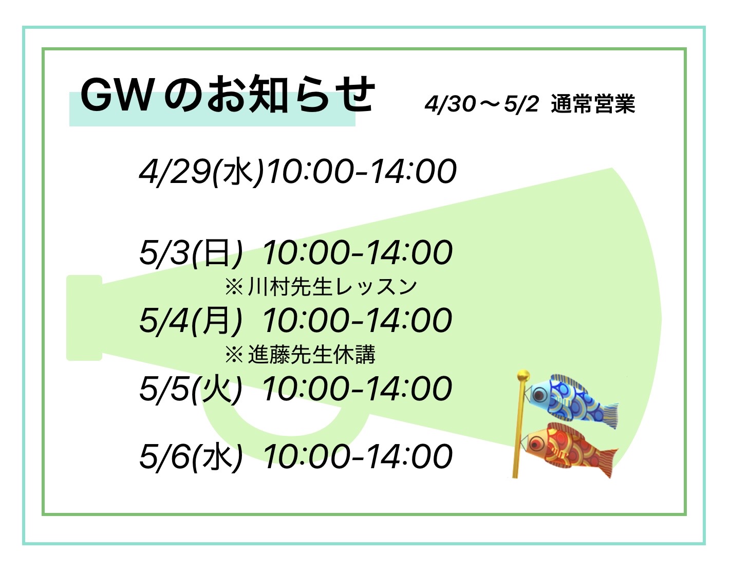 ゴールデンウィークの営業について 2026.04.21 未分類 ゴールデンウィークも休まず営業しております🏃🏻♂️ 祝日営業日は、閉店時間が午後2時となっておりますので、お気をつけください。 皆様のお越しを心よりお待ちしております😊 休講のお知らせ 前の記事 5月のお知らせ 次の記事